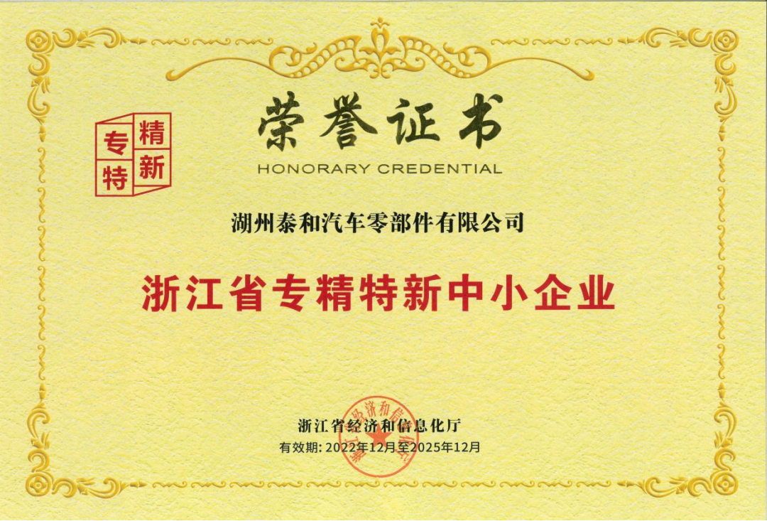 喜报!湖州泰和汽车零部件有限公司成功认定浙江省专精特新中小企业